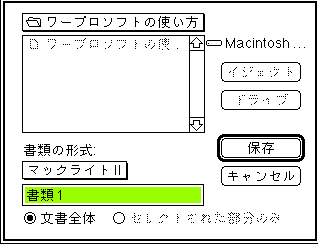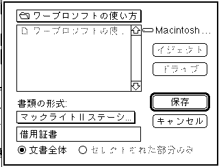 上記のウインドーで、「書類の形式」の下の「マックライトII」にポインターを当てて、 マウスのボタンを押し、飛び出してきたメニュー(ポップアップメニュー) から「マックライトIIステーショナリー」 を選択する。そして、文書名を適当に付ける。ここでは、借用証書とした。
