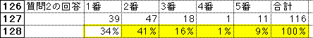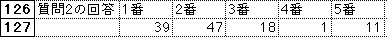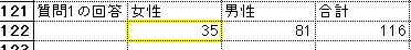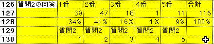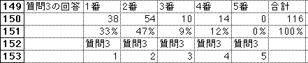 次に、これを質問3用の集計表にするために、A149を選択して、その内容を「質問3の回答」にする(いままでの内容の内、2を3に変える)。同様に、B152を選択して、その内容を「質問3」にする。そして、B152からF152を選択して、